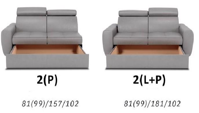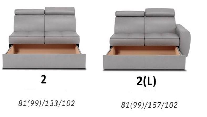 - Moduly s úložným prostorem: V modulech s úložným prostorem se nachází velmi praktický šuplík pro uložení např. dek, polštářů a lůžkovin. Šířka středového modulu 2 je 133 cm bez područek, s područkou 157 cm. Pohovka 2(L+P) s dvěma područkami má šířku 181 cm.