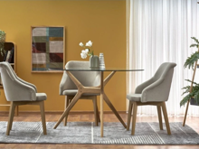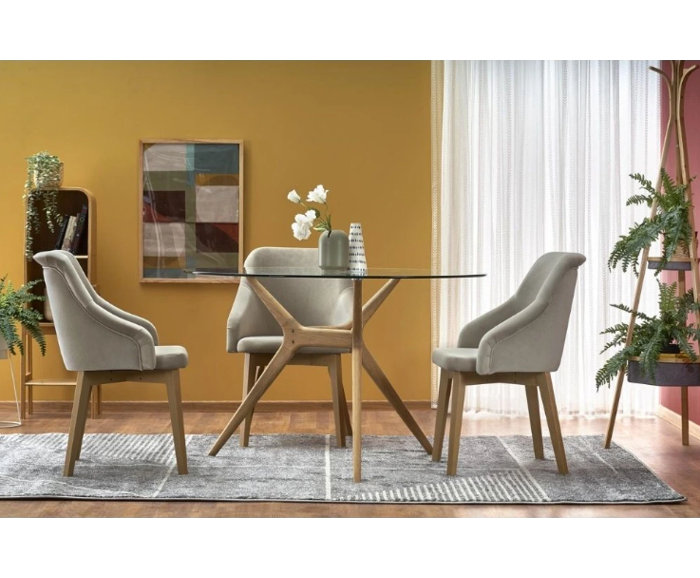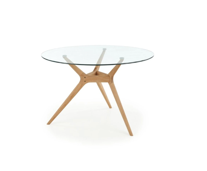 Stůl je vybaven skleněnou horní deskou, která přidává na lehkosti a eleganci, zatímco odborně zpracované nohy z dubového masivu zajišťují pevný a stabilní základ.