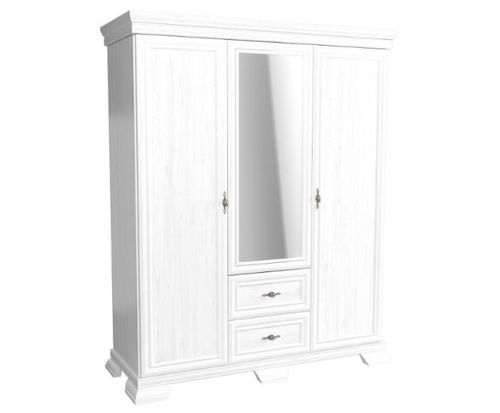 Prostorná šatní skříň KS2 má v levé i v pravé části šatní tyč. Uprostřed  jsou dvě zásuvky a dvířka se zrcadlem za kterými jsou 2 police. Výrazná jsou jeho profilovaná dvířka a přední plochy zásuvek. Originální ozdobné úchytky jsou z kovu. Skříň je vyrobena z kvalitního LTD a MDF v dekoru sosna andersen.