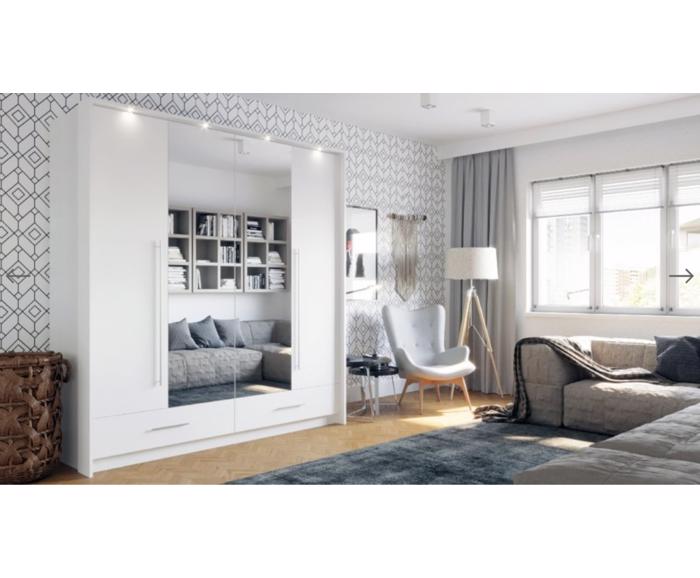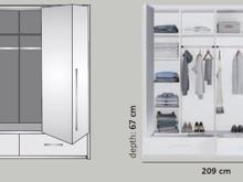 Šatní skříň Toledo 210 je vyrobena z lamina o síle 16 mm v bílém odstínu. Skříň nabízí dostatek úložného prostoru v podobě polic a šatních tyčí, ve spodní části se nacházejí dvě zásuvky. Otevírání dveří zajišťují kvalitní hliníkové kolejnice Hettich. Posuvné dveře se otevírají speciálním skládacím způsobem od středu směrem ke stranám.