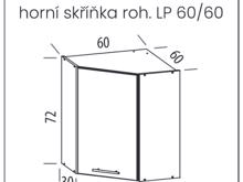 Rozměry skříňky (V x Š x H): 72 x 60 x 30 cm (KORPUS BÍLÝ MAT). Horní rohová skříňka s jednokřídlými dvířky šířky 60 cm. Součástí je police pro využití úložného prostoru. Skříňky otevíráme pomocí závěsů. Sklo ve spodní části je vybavené temperovaným sklem.