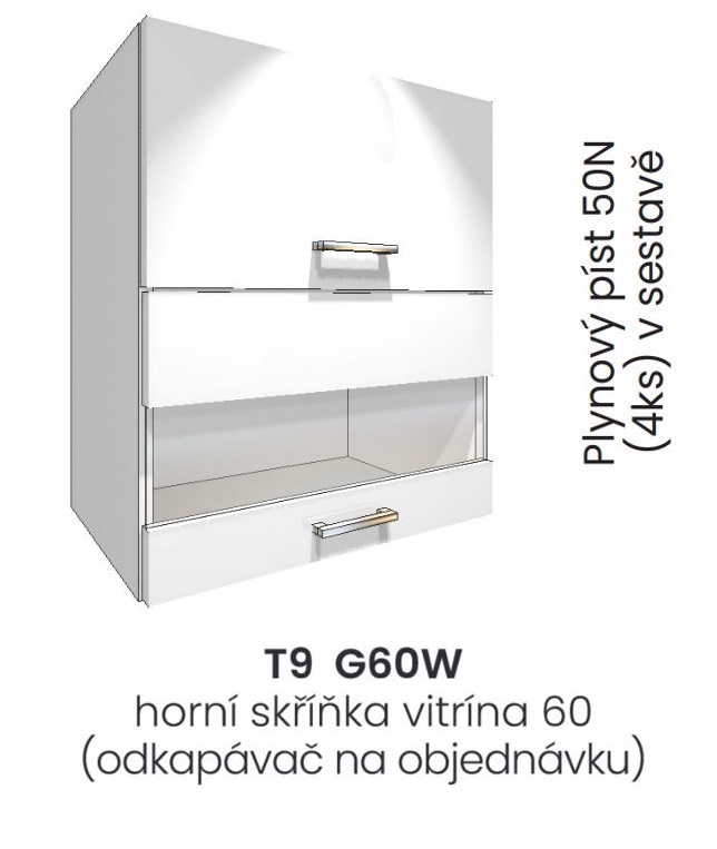 Rozměry skříňky (V x Š x H): 72 x 60 x 30 cm (KORPUS BÍLÝ MAT). Horní skříňka s dvěma výklopnými dvířky šířky 60 cm. Do skříňky lze dokoupit odkapávač. Skříňky otevíráme pomocí plynových pístů. Sklo ve spodní části je vybavené temperovaným sklem.