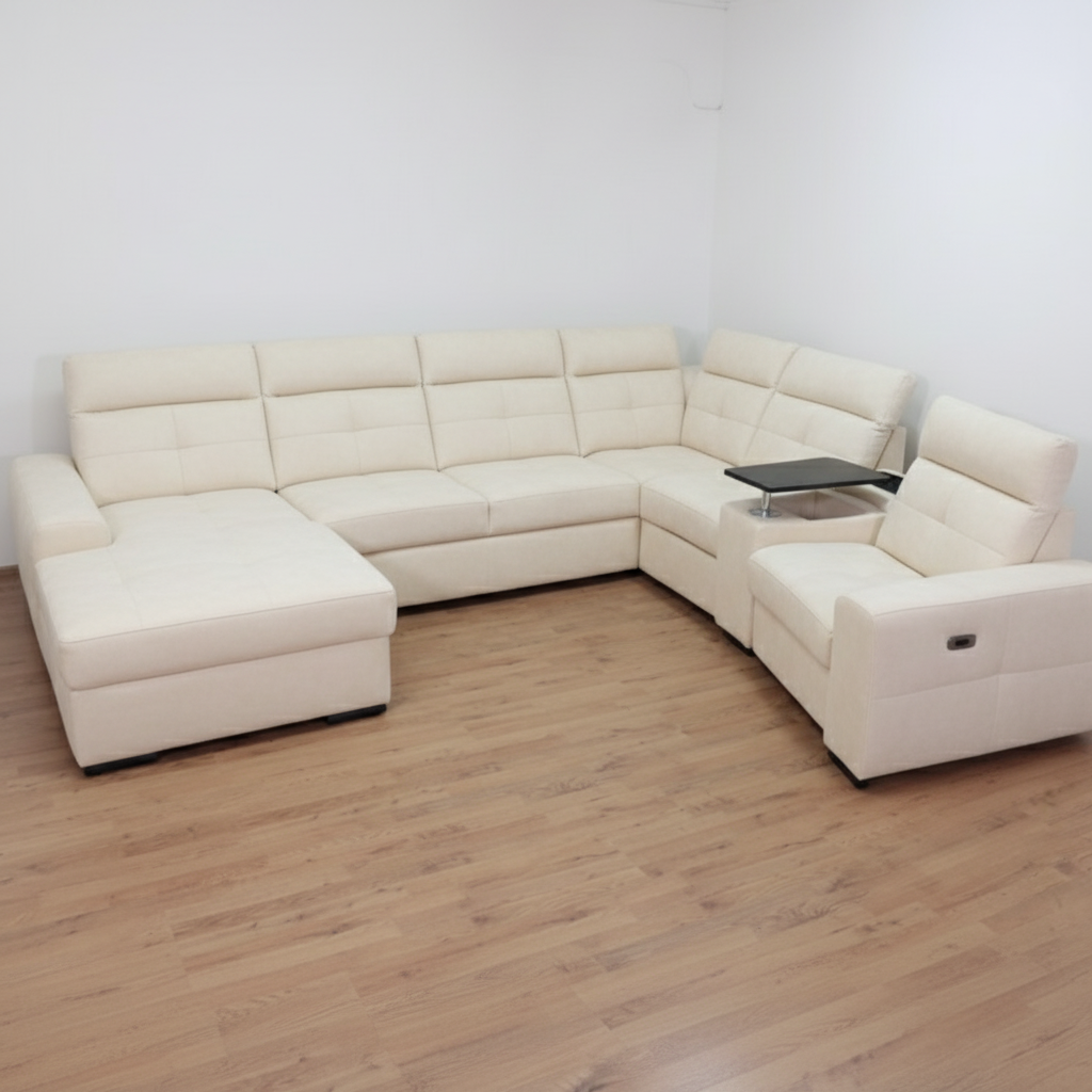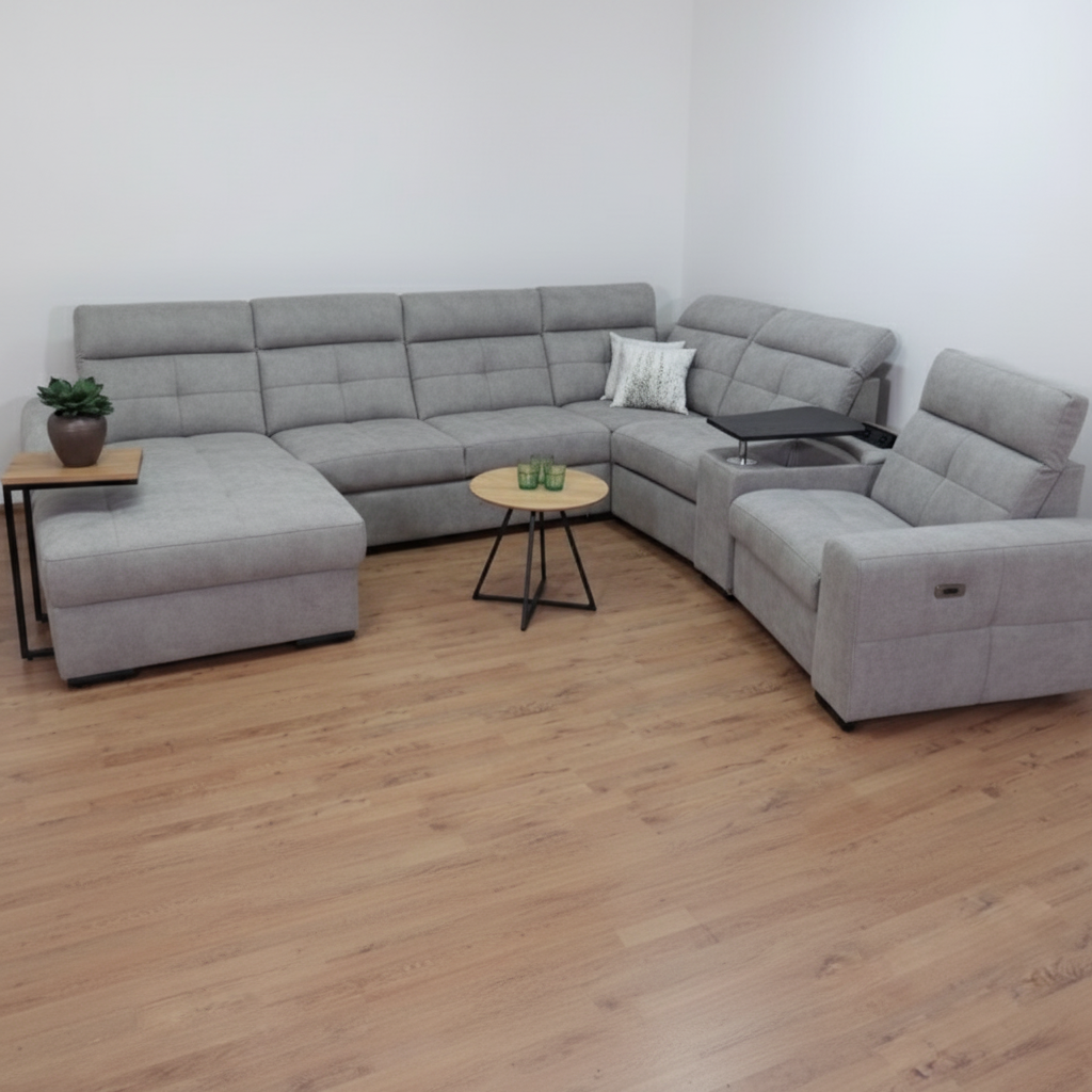 Velká rohová sedací souprava do U Kanton – HR pěna, elektrické křeslo, 7 polohovatelných záhlavníků, 2 úložné prostory, rozklad typu delfín, bar, otočný stolek, 2x zásuvky 230 V, 2x USB-C porty a 1x USB port.