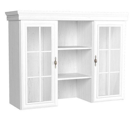 Vitrína (nádstavec) KN4 je určena ke komodě KK3. Po stranách má 2 prosklené dvířka a uvnitř dvě police. V prostřední části jsou umístěny dvě otevřené police. Vitrína je vyrobena z kvalitního LTD a MDF v dekoru sosna andersen. Nábytek má profilovaná dvířka a přední plochy zásuvek. Úchytky které jsou z kovu se zdobenou texturou dodávají nábytku na eleganci.
