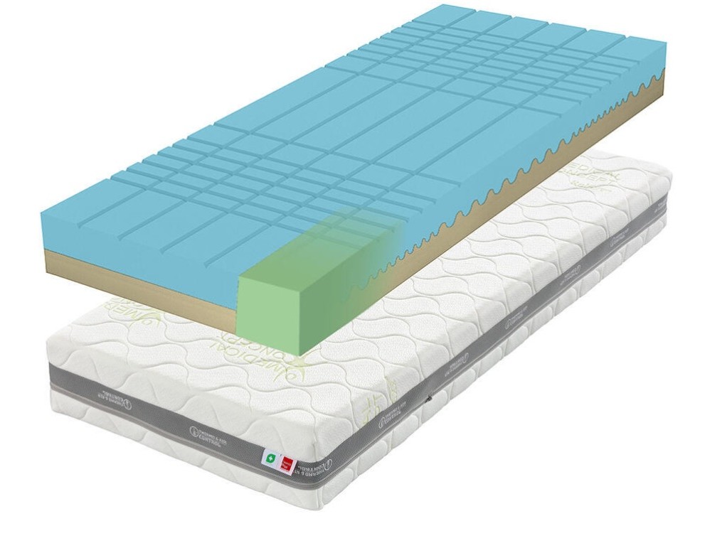 - Strana BLUE (Hybridní – měkčí): 9cm vrstva modré hybridní pěny spojuje vzdušnost studené pěny s jemnou přizpůsobivostí té paměťové. Povrchová profilace CUBE (CubeCare) ve tvaru výkyvných kostek reaguje na tlak těla a předchází vzniku proleženin. Ideální pro spánek na boku.