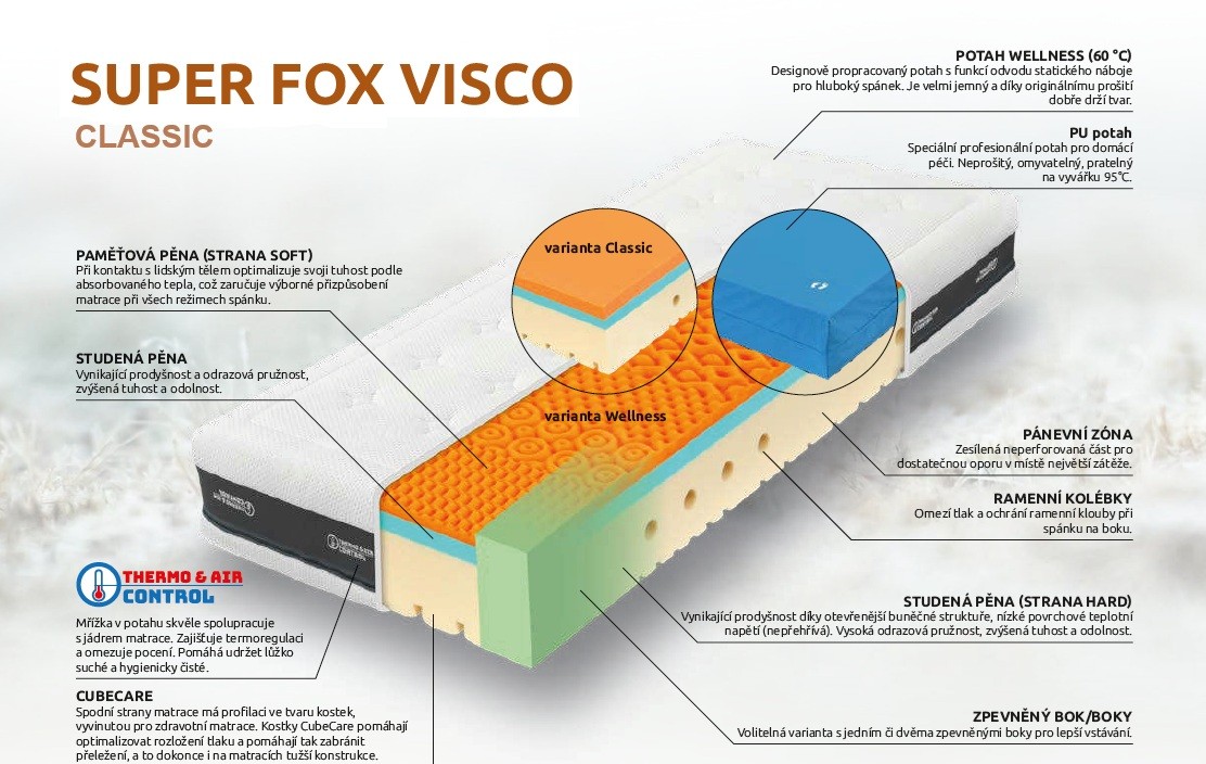 Matrace Super Fox Classic představuje špičkovou českou kvalitu a promyšlenou konstrukci z prvotřídních materiálů. Tato varianta s luxusní výškou 24 cm a rovnou ložnou plochou Classic je ideální pro ty, kteří hledají maximální pohodlí líné pěny bez masážní profilace.